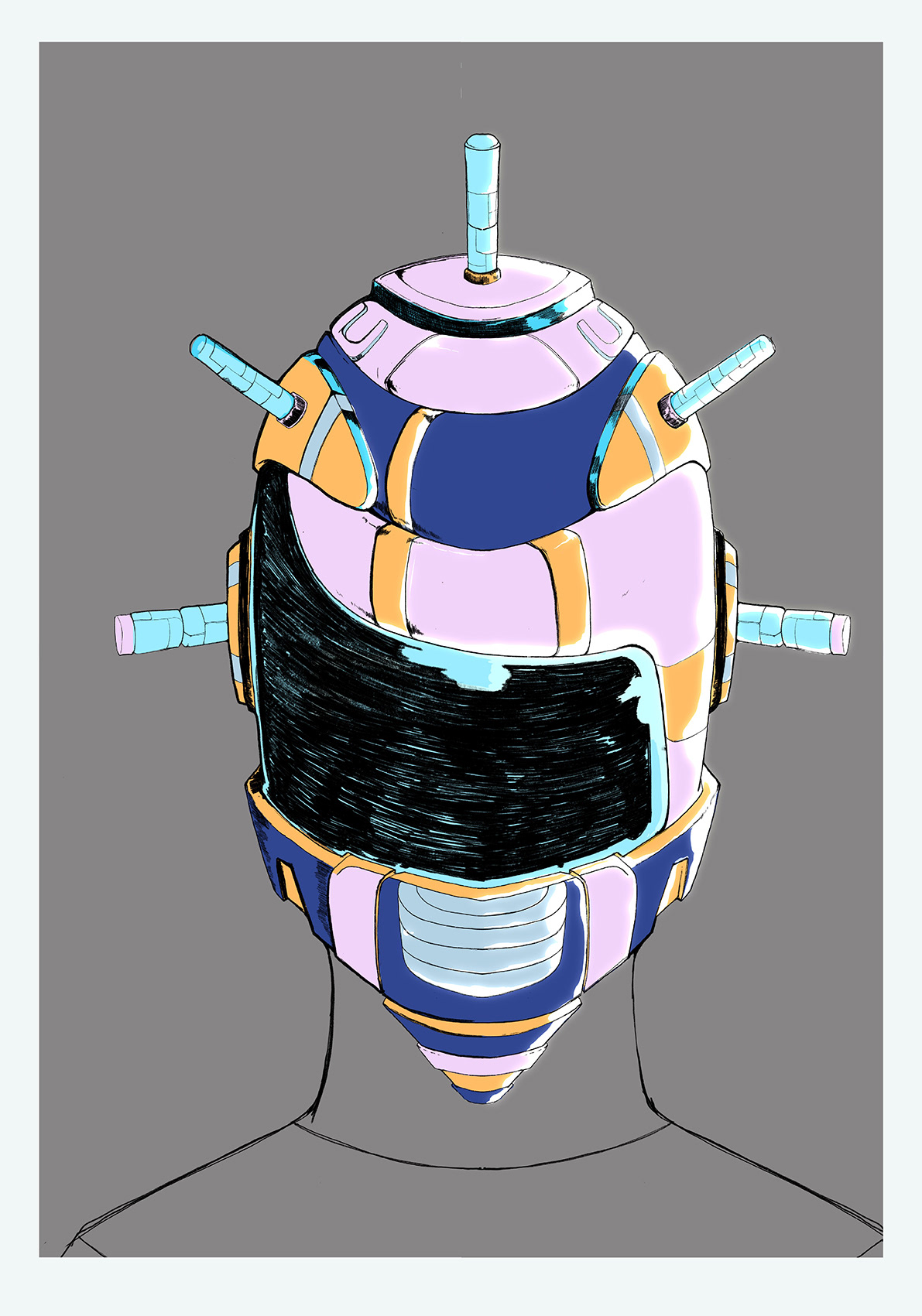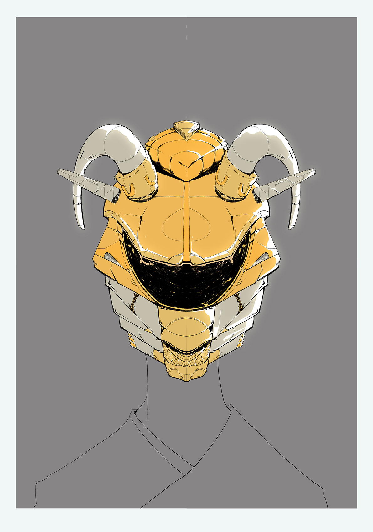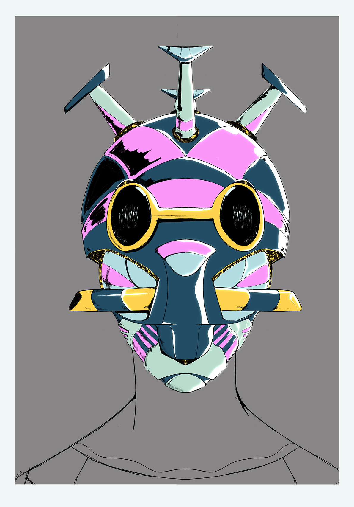 Entre culture d'origine et culture choisi. Ici on pourra simplement voir le masque aux allures Africaine couplé avec, le casque sentaï de la pop culture Japonaise.